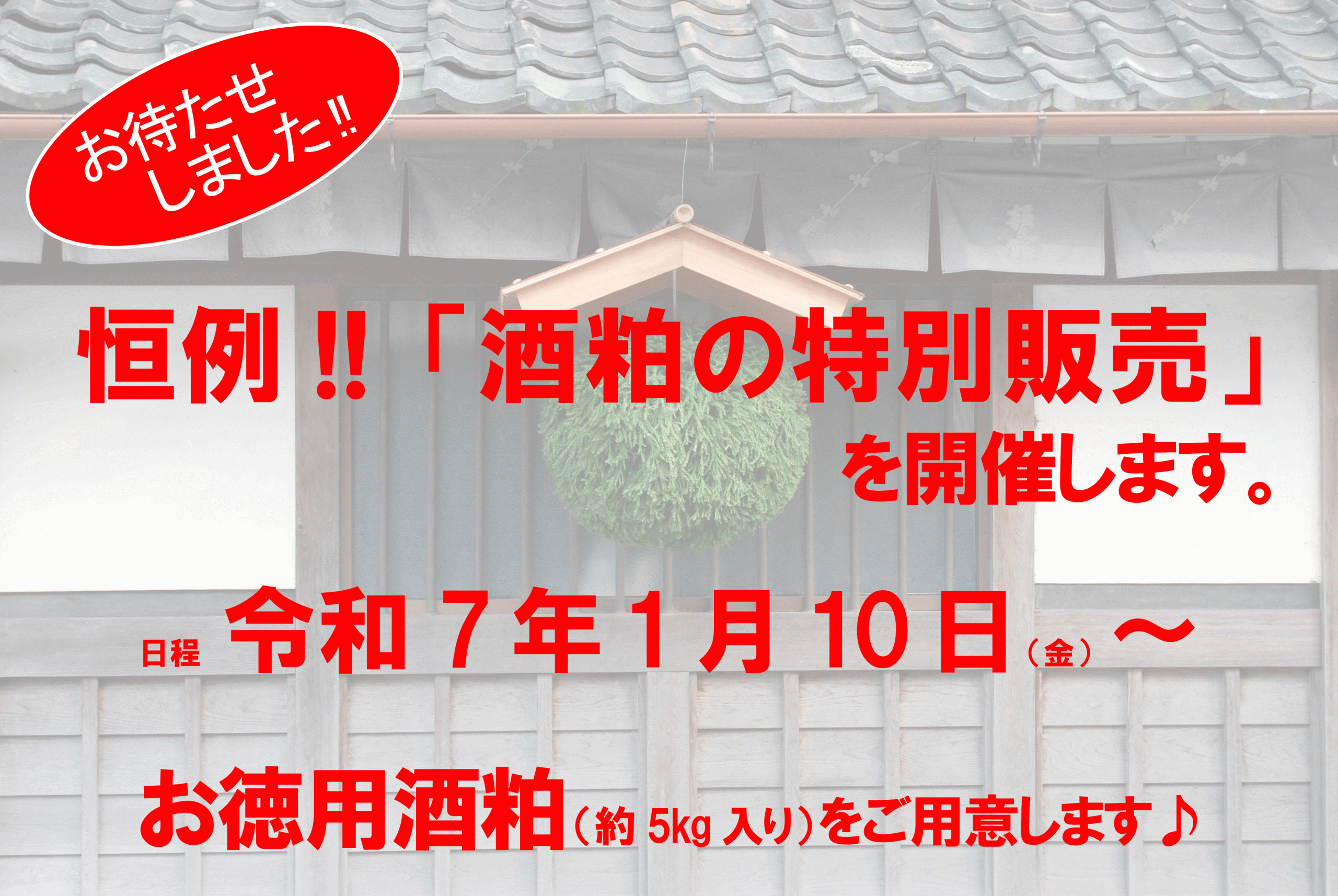 「お徳用酒粕」は令和7年1月10日(金)から店頭販売開始します! 投稿日:2024.12.18 毎年 楽しみお待ちいただいているお客様も多い、「お徳用酒粕(約5Kg入り)」を令和7年1月10日(金)から店頭販売開始します♪ 皆様のお越しをお待ちしております。 ※おひとり様1袋限定