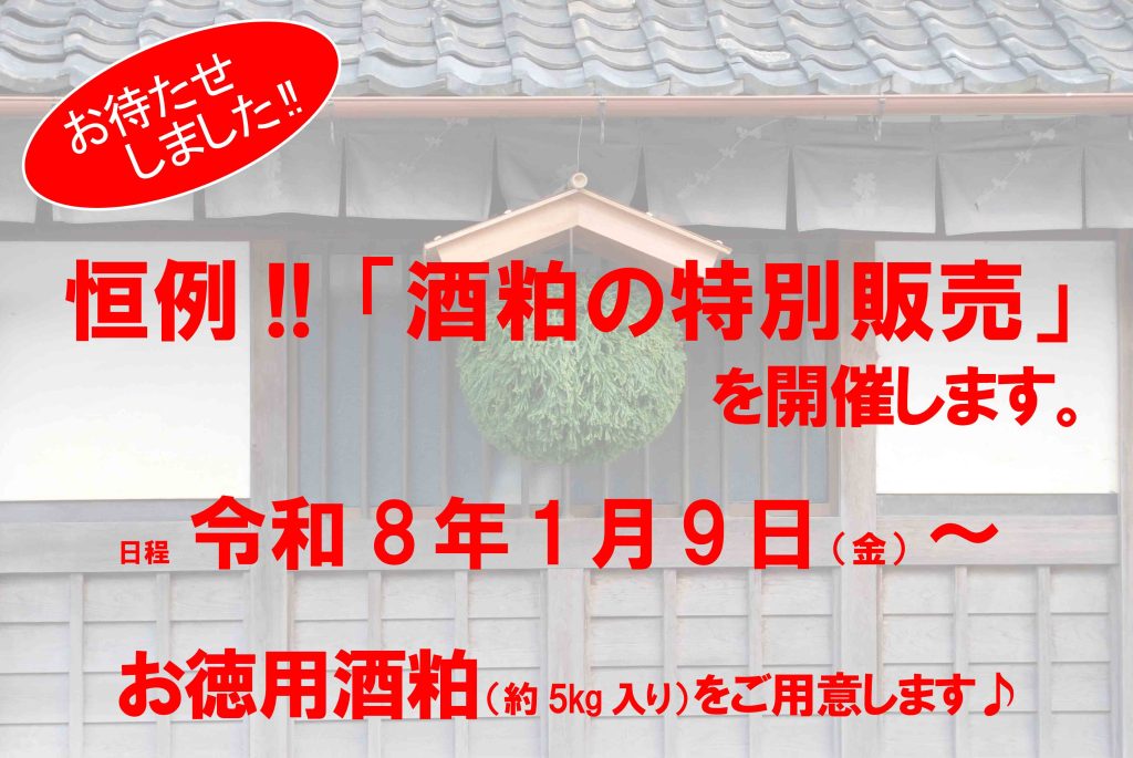 「お徳用酒粕」は令和8年1月9日(金)から店頭販売開始します! 投稿日:2025.12.12 毎年 楽しみお待ちいただいているお客様も多い、「お徳用酒粕(約5Kg入り)」を令和8年1月9日(金)から店頭販売開始します♪ 皆様のお越しをお待ちしております。 ※おひとり様1袋限定です。ご協力、ご理解のほど宜しくお願い申し上げます。