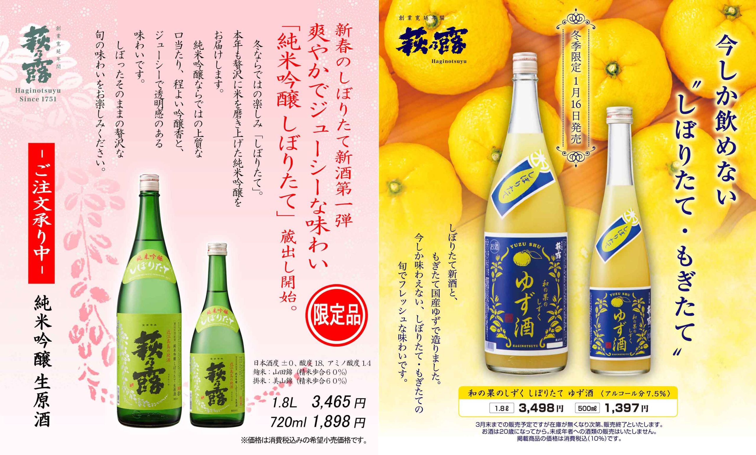2026年の新酒第一弾は「純米吟醸 しぼりたて」と「しぼりたて ゆず酒」です。