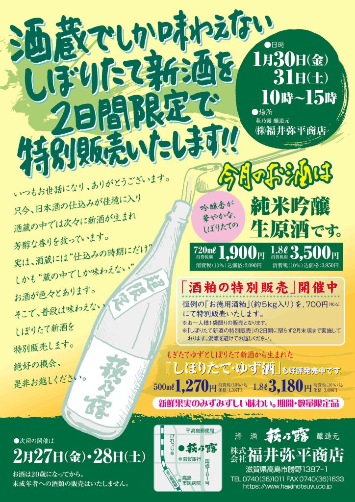 来る1月30日(金)・31日(土)の2日間限定で、普段は蔵出ししていないしぼりたて生原酒の特別販売を開催します。酒蔵でしか手に入らない限定酒をご用意します。