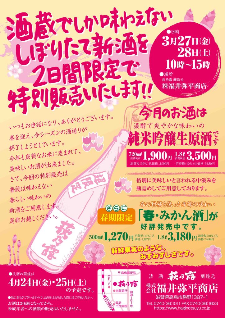 る3月27日(金)・28日(土)の2日間、弊社店頭で普段は蔵出ししていない、酒蔵限定のしぼりたて生原酒の特別販売を開催します(両日とも10:00~15:00)。
