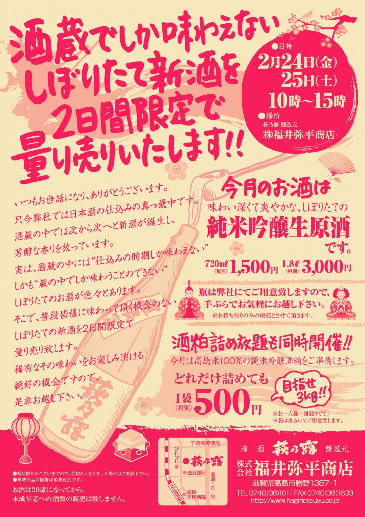 2月の量り売りは味わい深くて爽やかなしぼりたての純米吟醸生原酒を予定して